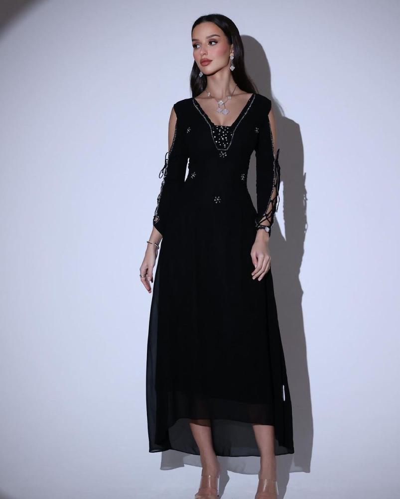 الخامه :شيفون ناعم مبطن + تطريز يدوي شك بالقماش نفسسه +فصوص كرستال